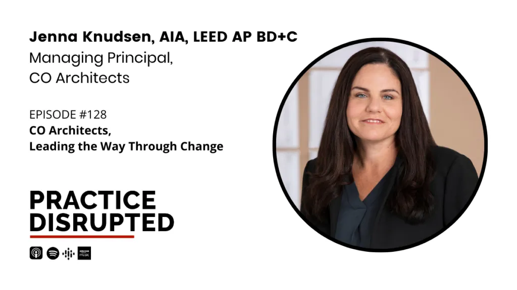 Tune in for a conversation with Jenna Knudsen, Managing Principal at CO Architects, where we learn about Jenna’s transition into the role of Managing Principal, the challenge of stepping into a new role during COVID, and how continual improvement shows up in the 160 person practice.