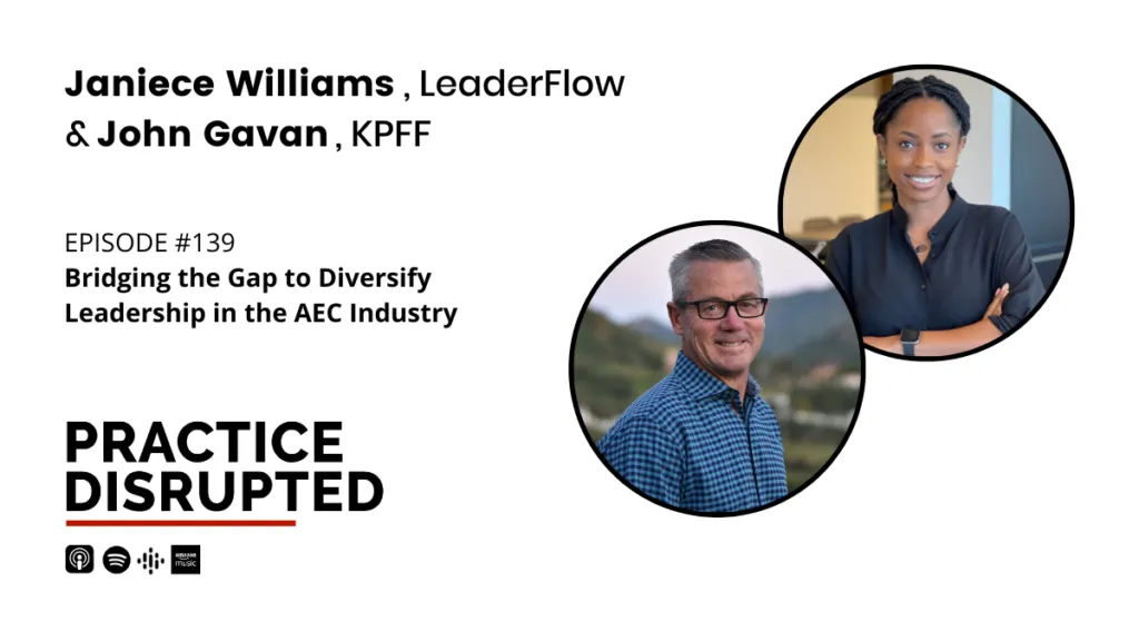 On this episode of Practice Disrupted, we sit down with the team at LeaderFlow: Executive Director Janiece Williams, and John Gavan, CEO of KPFF Consulting Engineers, to discuss their leadership development program and the vision they have to bridge the gap between leadership and professionals of color in the AEC industry.
