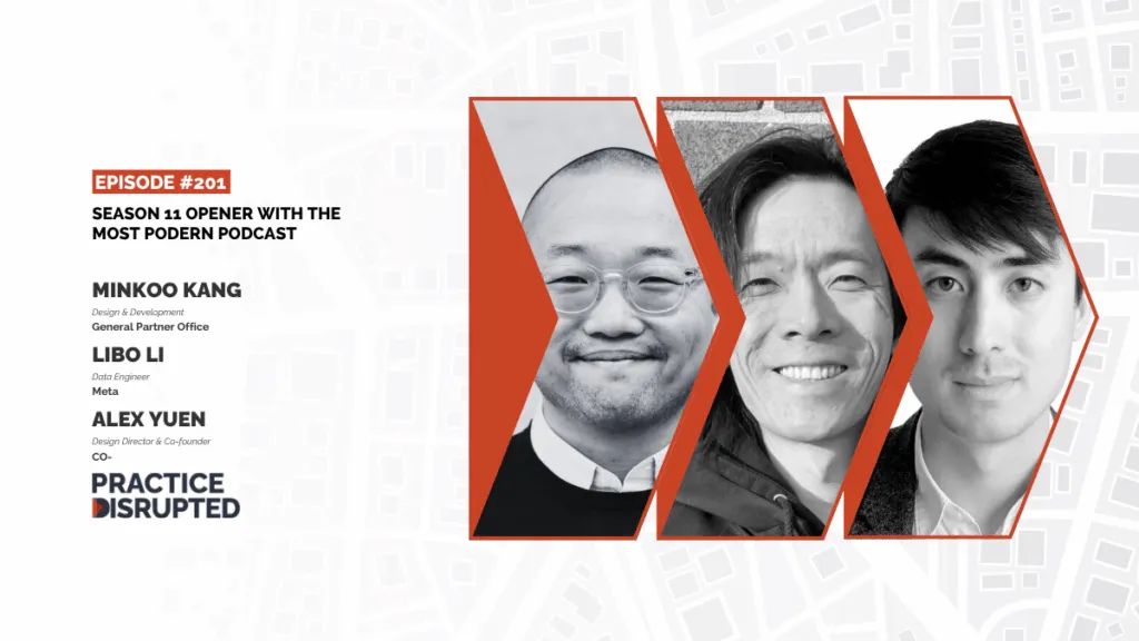 To kick off Season 11, we welcome the three hosts of the Most Podern Podcast: Alex Yuen, Minkoo Kang, and Libo Li. They are three friends who, since their architectural education, have forged distinct, non-traditional careers that challenge the conventional definition of practice. The episode delves into their journeys as an architect-developer, an OMA designer turned developer and MIT instructor, and a self-proclaimed “career job changer” now working as a data engineer at Meta.