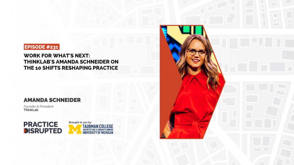 About the Episode About the Episode If workplace culture is failing, are we brave enough to use Gen Z as the prototype for what comes next? In this episode of Practice Disrupted, Amanda Schneider, the founder and president of ThinkLab, joins host Evelyn Lee to discuss her transition from a “designer by degree” to a […]