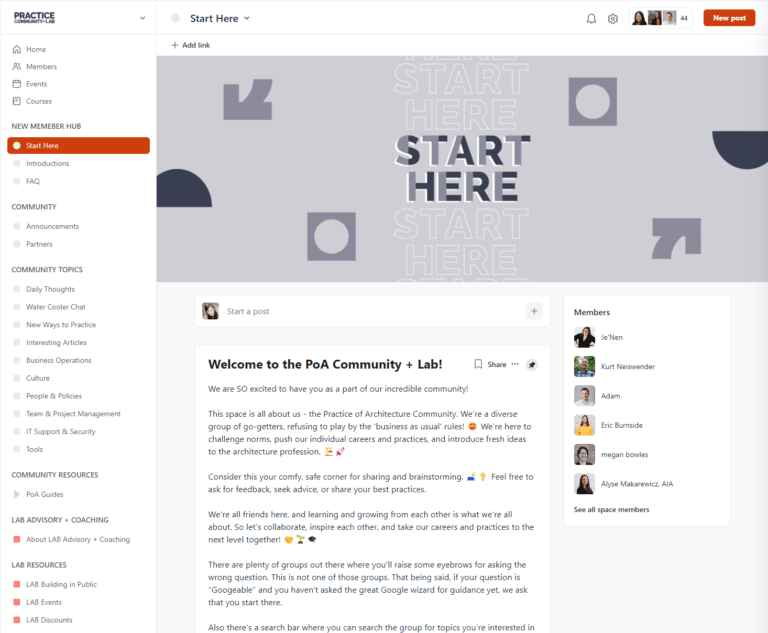 The Practice Community + Lab is a launchpad for anyone in architecture. It fuels thriving careers, drives the entrepreneurial spirit in practice, and sparks innovation through collective learning and cross-industry insights.